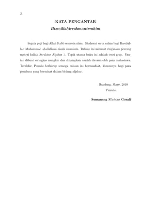 Dokumen ini adalah ringkasan materi kuliah tentang teori grup yang mencakup definisi grup, subgrup, grup komutatif, serta konsep-konsep terkait seperti operasi biner dan grup hingga/tak hingga. Penulis berharap tulisan ini bermanfaat bagi mahasiswa yang belajar aljabar. Materi yang disajikan diringkas dengan jelas untuk memudahkan pemahaman.