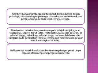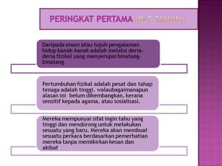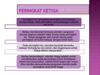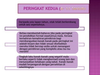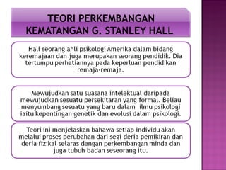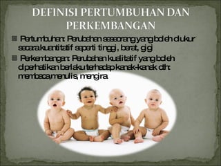 Dokumen ini membahas pertumbuhan dan perkembangan kanak-kanak mengikut teori berbagai tokoh termasuk Arnold Gesell dan Robert Havighurst. Ia menjelaskan peringkat perkembangan bersama dengan tugas yang perlu diselesaikan pada setiap peringkat, yang dipengaruhi oleh faktor alam sekitar dan budaya. Penekanan diberikan pada pentingnya menyelesaikan tugasan perkembangan untuk mencapai kesejahteraan individu pada peringkat berikutnya.