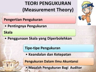 Teori pengukuran merupakan teori penting dalam akuntansi. Ada berbagai skala dan tipe pengukuran yang dapat digunakan, namun pengukuran yang andal dan akurat sangat diperlukan agar dapat memberikan informasi yang berguna bagi pengambil keputusan. Auditor memiliki peran penting dalam memastikan pengukuran dan penilaian yang dilakukan manajemen telah sesuai standar.