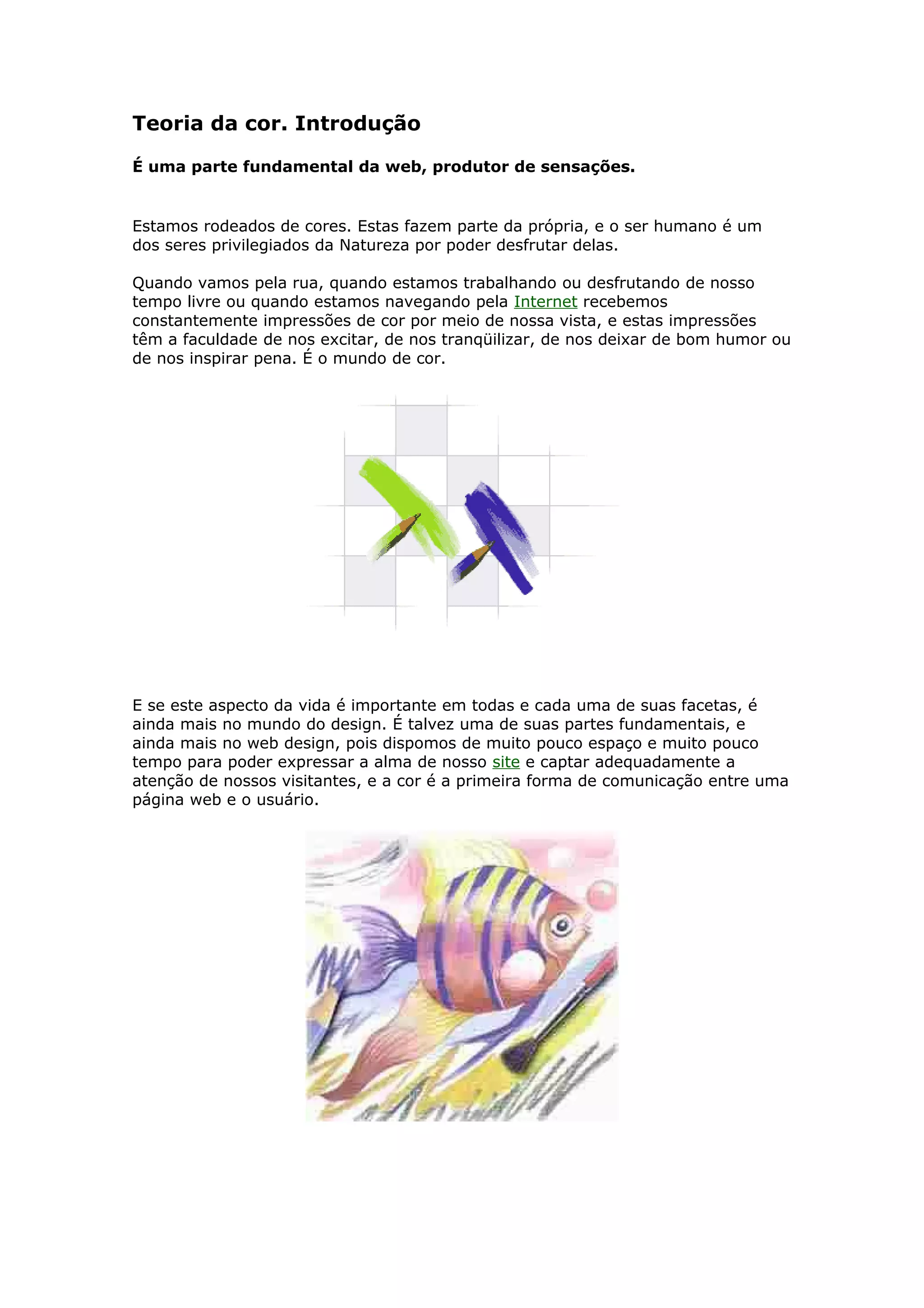 Este documento discute a importância da cor no design de sites, especialmente no design web. A cor é uma parte fundamental da experiência online e é frequentemente a primeira forma de comunicação entre um site e o usuário. Os primeiros segundos em que alguém vê uma página são cruciais e a distribuição e gama de cores são provavelmente o que mais chama a atenção. Embora os designers web tenham menos cores e espaço para trabalhar com em comparação a outros campos artísticos, a cor ainda desempenha um papel vital na expressão do conteúdo de um site