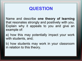The document discusses the social constructivist theory of learning. Social constructivism posits that learning occurs through social interactions and collaboration. It emphasizes that learners construct new understandings based on interactions with peers and teachers within their social environment and culture. The author believes this theory will impact their teaching in the following ways: (1) Students will construct knowledge actively rather than passively receive information, (2) Learning will be inquiry-based through discussion, problem-solving in groups, (3) Students will learn collaboratively by sharing ideas and building on each other's knowledge. In the classroom, students will work in mixed-ability groups to solve problems and help each other learn.
