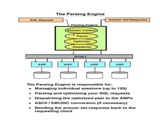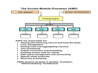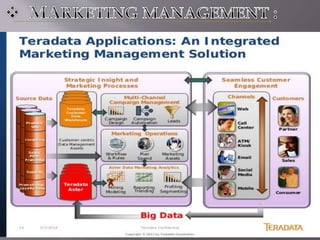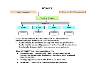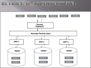 This document discusses Teradata, an RDMS designed for large commercial databases. It provides a brief history of Teradata starting in 1979 and its acquisition by NCR in 1992. It also lists versions released from 2002-2012 and their new features. The advantages are its parallel processing capacity to handle large loads and queries concurrently. It has a shared nothing architecture providing high fault tolerance. Disadvantages include its lack of suitability for small transactions and higher costs. The conclusion states Teradata makes creating and dropping tables easy for data warehousing.