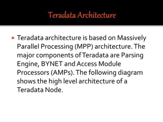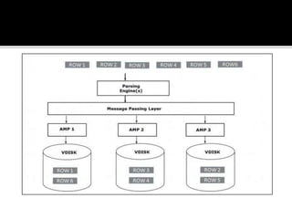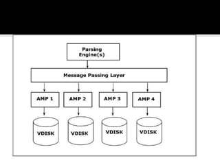 The document summarizes the architecture of a Teradata database system. It consists of nodes that each contain a parsing engine, BYNET messaging layer, and access module processors (AMPs). The parsing engine receives queries, prepares execution plans, and returns results. BYNET passes data between the parsing engine and AMPs. AMPs store and retrieve data from disks and perform query operations like filtering and aggregation. Records are distributed evenly among AMPs.