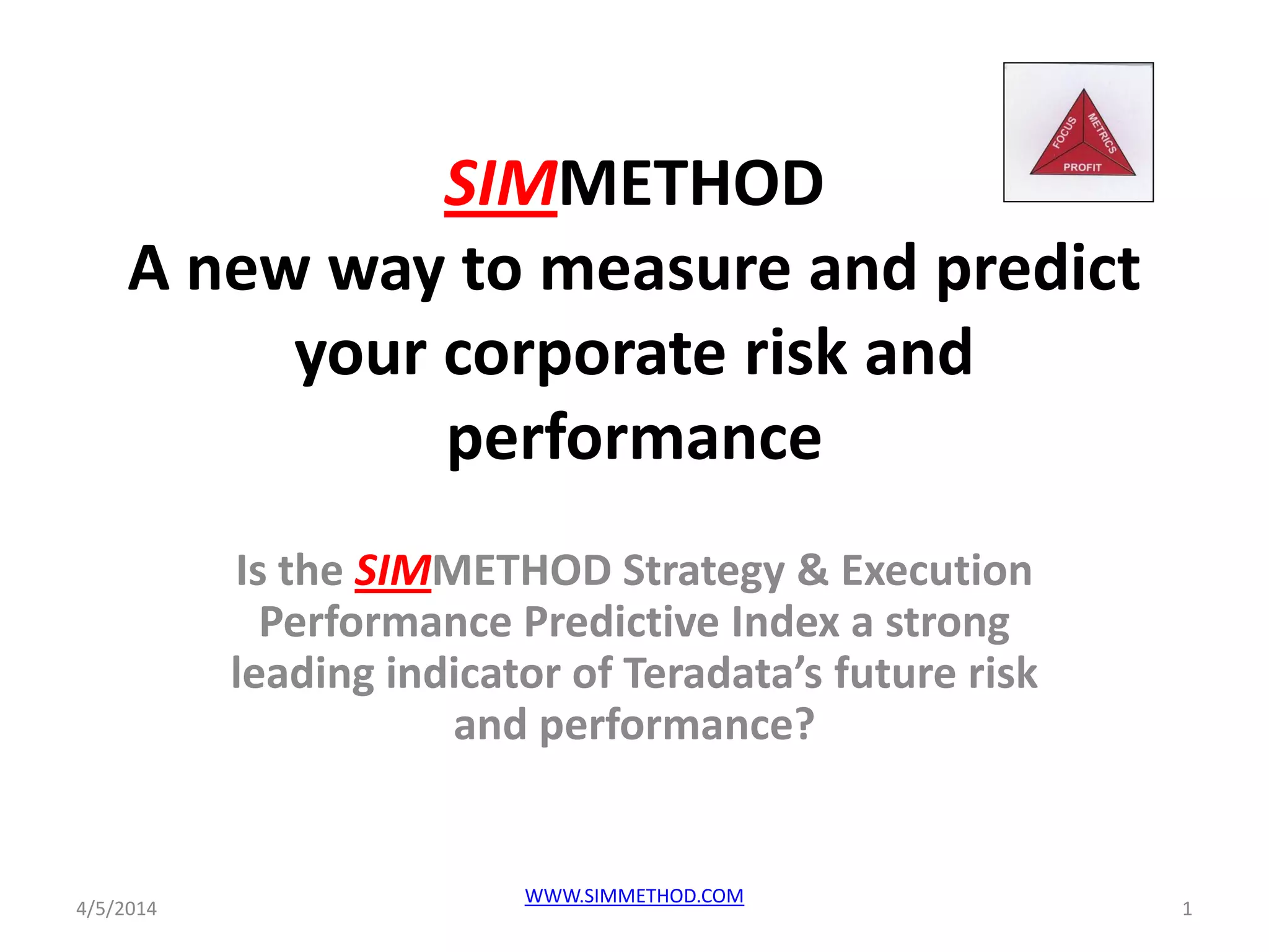 The document presents the simmethod Strategy & Execution Performance Predictive Index, which aims to measure and predict corporate risk and performance amidst rising competition in the marketplace. It highlights Teradata's current challenges and outlook, emphasizing the need for industry-agnostic metrics to better assess corporate strategies and decision-making. The report suggests that understanding these predictive indices could enhance management's ability to navigate risks and capitalize on opportunities in a dynamic competitive environment.