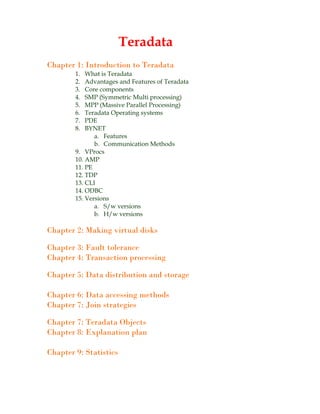 The document is a comprehensive guide to Teradata, covering its introduction, advantages, core components, and operating systems. It includes detailed chapters on various technical aspects such as fault tolerance, transaction processing, data storage, and performance monitoring. Additionally, it provides business contact information for further inquiries.