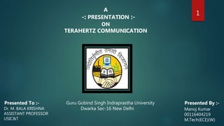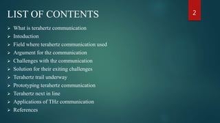 The document discusses terahertz communication, which uses the terahertz band between 0.3-10 THz for wireless communication. It notes terahertz communication could provide multi-gigabit data rates and help realize applications requiring very high bandwidth. However, challenges include high propagation losses, molecular absorption effects, and short communication ranges. Potential solutions discussed include using ultra-massive MIMO arrays, reconfigurable intelligent surfaces to enhance beamforming gains and extend communication ranges, and distance-aware waveform/modulation designs optimized for terahertz bands.