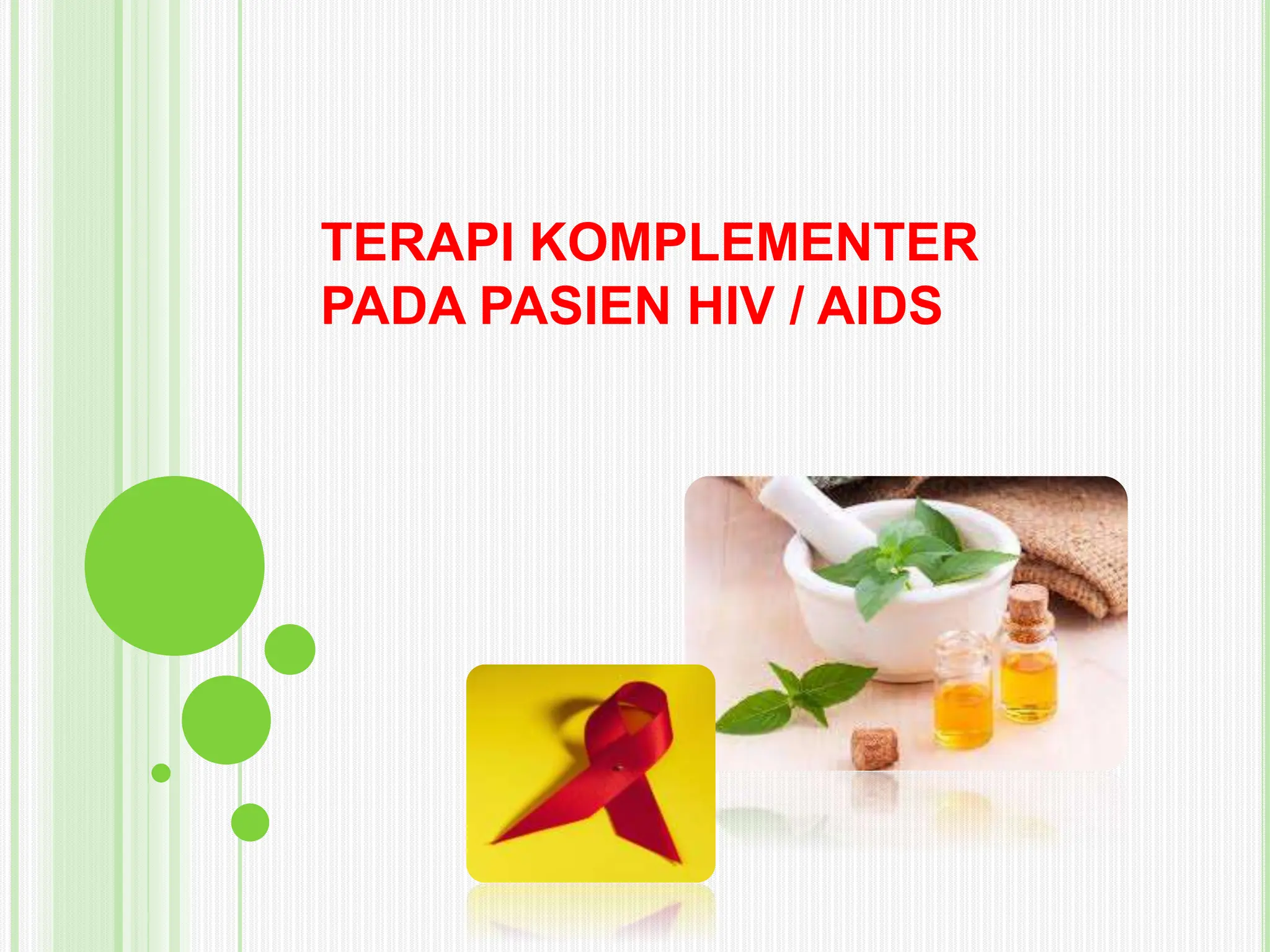 Dokumen ini membahas terapi komplementer untuk pasien HIV/AIDS, menyoroti pentingnya menjaga sistem kekebalan tubuh agar bisa hidup sehat meskipun terinfeksi. Berbagai jenis terapi, termasuk informasi, spiritual, nutrisi, dan fisik, bisa membantu memperbaiki kualitas hidup pasien. Meskipun HIV/AIDS belum bisa disembuhkan, terapi komplementer memberikan harapan hidup yang lebih baik dan produktif bagi pengidap.