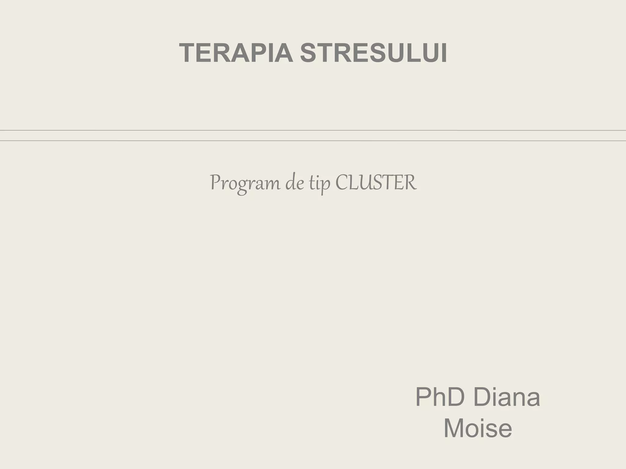 Documentul descrie programul de terapie a stresului condus de PhD Diana Moise, care se axează pe identificarea surselor stresului și abordarea acestora prin diverse tehnici artistice și workshop-uri. Efectele stresului sunt prezentate pe plan fizic, psihologic și comportamental, incluzând tulburări somatice și psihice. Programul include întâlniri cu psihologi, cursuri de PCM, TCM, și sesiuni de evaluare, oferind asistență suplimentară prin contactul prin e-mail.