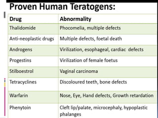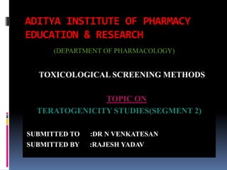 This document discusses teratogenicity studies, which assess the ability of substances to cause birth defects. It covers the mechanisms, principles, types of studies, observations, data reporting, and evaluation. Regarding study types, it describes single generational studies under FDA guidelines to evaluate effects on fertility and reproductive performance. Segment II assesses developmental toxicity by exposing pregnant rats to the test substance from days 6-15 of gestation, then examining fetuses for abnormalities on day 20. The document provides details on study procedures, observations, and reporting of results to evaluate if the substance is teratogenic.