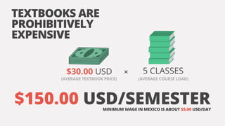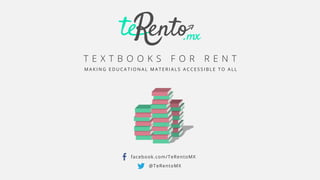 This document describes a peer-to-peer textbook rental service called TeRentoMX that aims to make educational materials more affordable and accessible to students in Mexico. It notes that textbook prices are prohibitively expensive for many students, costing on average $150 per semester while Mexico's minimum wage is only $5 per day. TeRentoMX allows students to rent used textbooks from other students for 70% less than commercial prices, saving students money while generating income from unused books. The document estimates the potential market size and revenue opportunity for TeRentoMX in Guadalajara based on textbook spending among the city's 200,000 college students.
