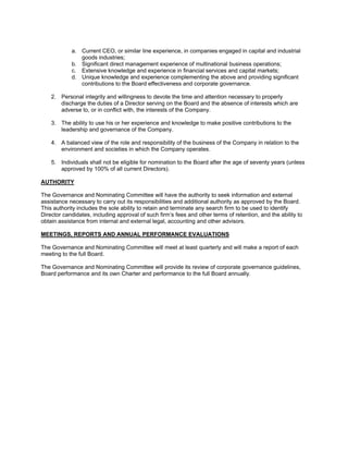 This document outlines the charter of the Governance and Nominating Committee of Terex Corporation. It establishes that the committee is responsible for identifying and nominating candidates for the board, developing corporate governance guidelines, and evaluating board performance. The committee must consist of at least three independent directors appointed by the board. It has the authority to retain outside advisors and legal counsel. The committee meets at least quarterly and reports to the full board, providing an annual review of governance guidelines, board performance, and its own charter and performance.