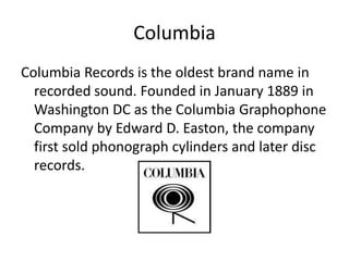 Sony Music is a global music company founded in 1929 as Columbia Graphophone Company. It owns several record labels including Columbia Records, the oldest brand name in recorded sound founded in 1889; Epic Records, originally a jazz label expanded to various genres; and Relentless Records, a UK urban music label. Legacy Recordings is Sony's catalog division handling reissues from Columbia, Epic, RCA and other labels. Doug Morris was CEO from 1995 to 2011 when he was replaced by Lucian Grainge. Sony Music reported $5.6 billion in net revenue in 2021.