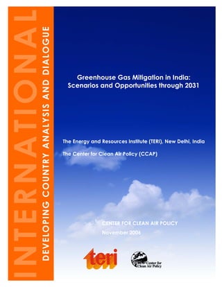 This document summarizes a report on greenhouse gas mitigation opportunities in India's electricity sector through 2031. It provides an overview of India's electricity sector, including historical energy consumption and emissions trends. Baseline forecasts predict rising electricity production, energy use, and emissions through 2031. The report evaluates options to mitigate emissions growth in the sector, including deploying renewable energy, improving energy efficiency, and adopting cleaner coal technologies. It constructs a marginal abatement cost curve to assess these options and their costs. The analysis aims to inform India's climate policies and implementation strategies.