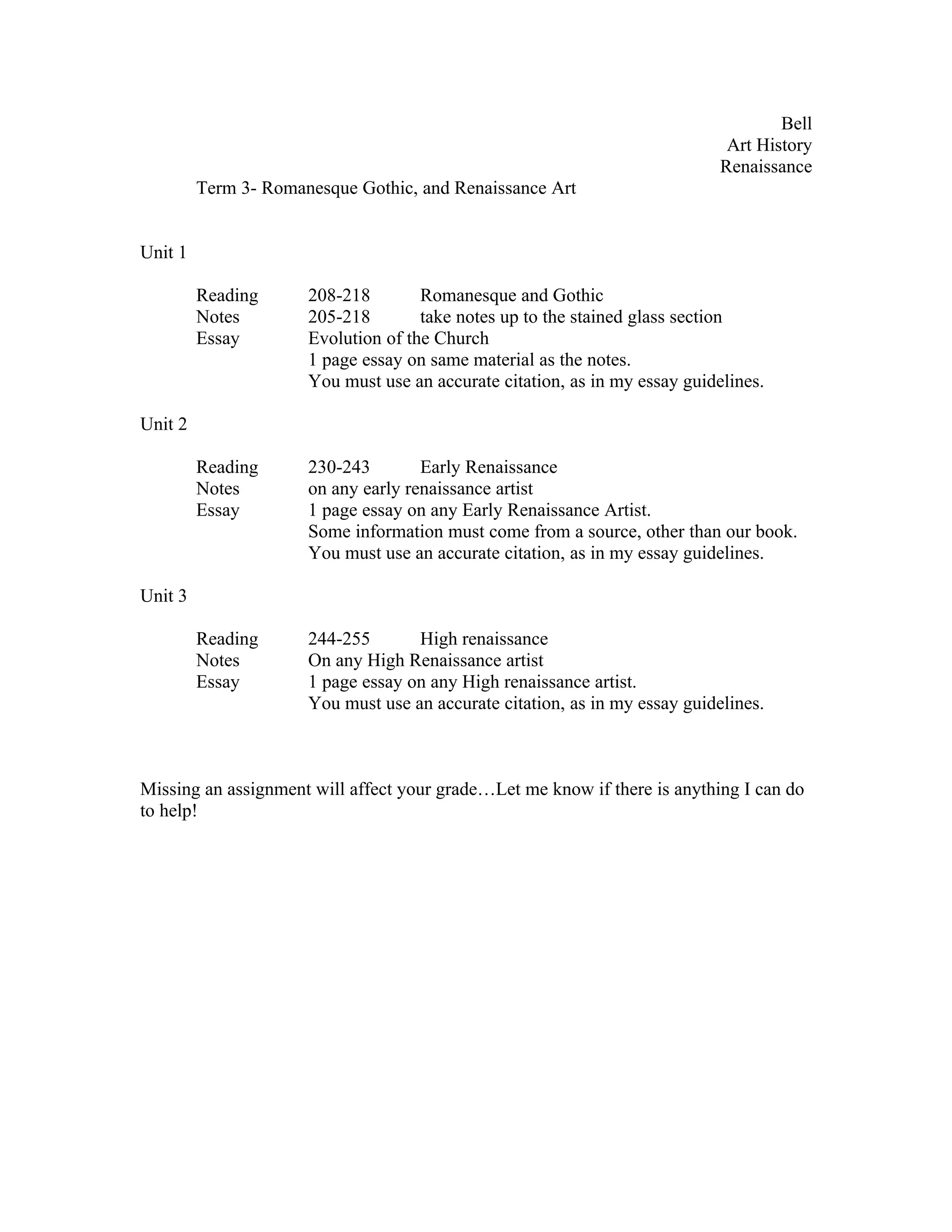 This document outlines an art history course covering the Renaissance period divided into three units. The first unit focuses on Romanesque and Gothic art and architecture and requires reading, note taking, and a one page essay on the evolution of the church. The second unit covers Early Renaissance art with reading, notes on an artist, and a one page essay on an Early Renaissance artist using an outside source. The third unit is on High Renaissance art, also requiring notes on an artist and a one page essay with a citation. Missing assignments could impact the student's overall grade.
