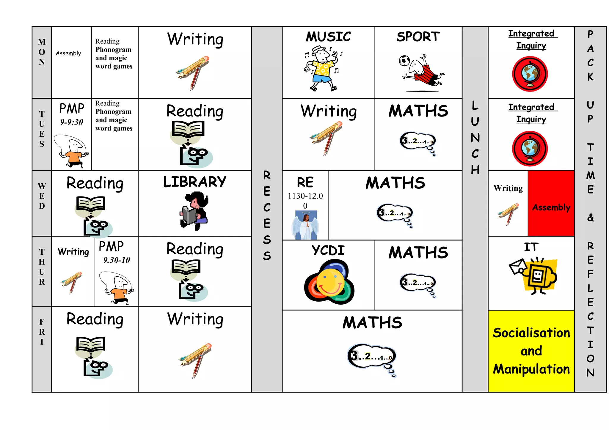 The document outlines a school timetable with various subjects scheduled throughout the week including reading, writing, maths, integrated inquiry, assembly, library, physical education, and socialization and manipulation. Subjects are interspersed with breaks for things like phonogram and word games. The timetable shows the daily schedule from Monday to Thursday.