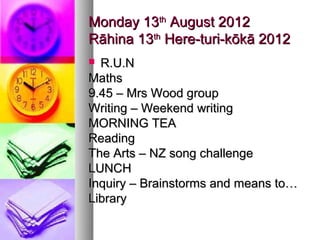 This document provides a weekly schedule and activities for a classroom from August 13th to August 16th, 2012. It includes details of daily lessons, assignments, and assessments for subjects like math, writing, reading, and physical education. Quick quizzes and math problems are also listed for each day. Classroom activities include a language swap, persuasive writing assessment, and a mystery box writing lesson. Sports and other physical activities like block running are scheduled throughout the week during breaks.