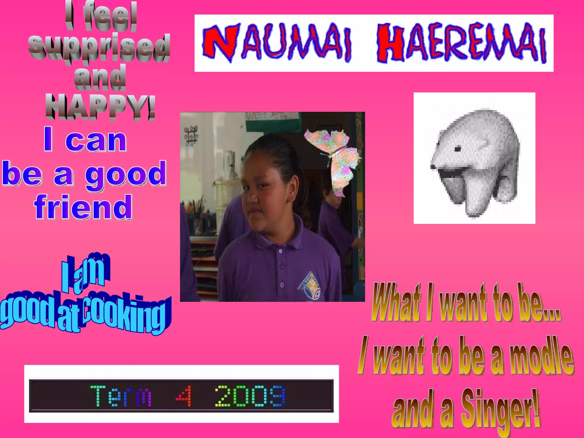 The document summarizes a student's progress in various subjects over multiple terms. It includes goals for spelling, respectfulness, art skills, cooking, becoming a model and singer. Subjects addressed include spelling, art, math, Te Reo, writing, health and PE, and speeches. The student's monster portrait is described and goals are set for learning 3D shapes in math and Te Reo words and translations.