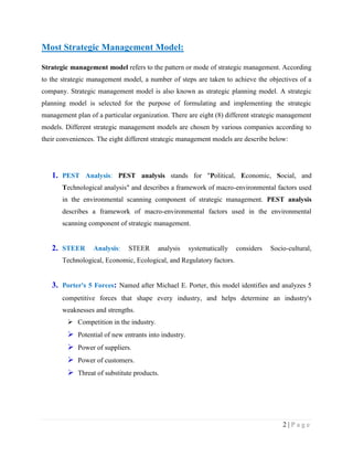 The document outlines the concept of strategy as a high-level plan for achieving goals amid uncertainty, emphasizing the importance of adaptability and resource management. Various strategic management models, including PEST analysis, SWOT analysis, and Porter's Five Forces, are discussed, along with a profile of Beiersdorf AG, a German personal care company, which includes its history, market positioning, and strategic insights. The document further explores market analysis frameworks and objectives aimed at enhancing Beiersdorf's competitive edge in the cosmetics industry.