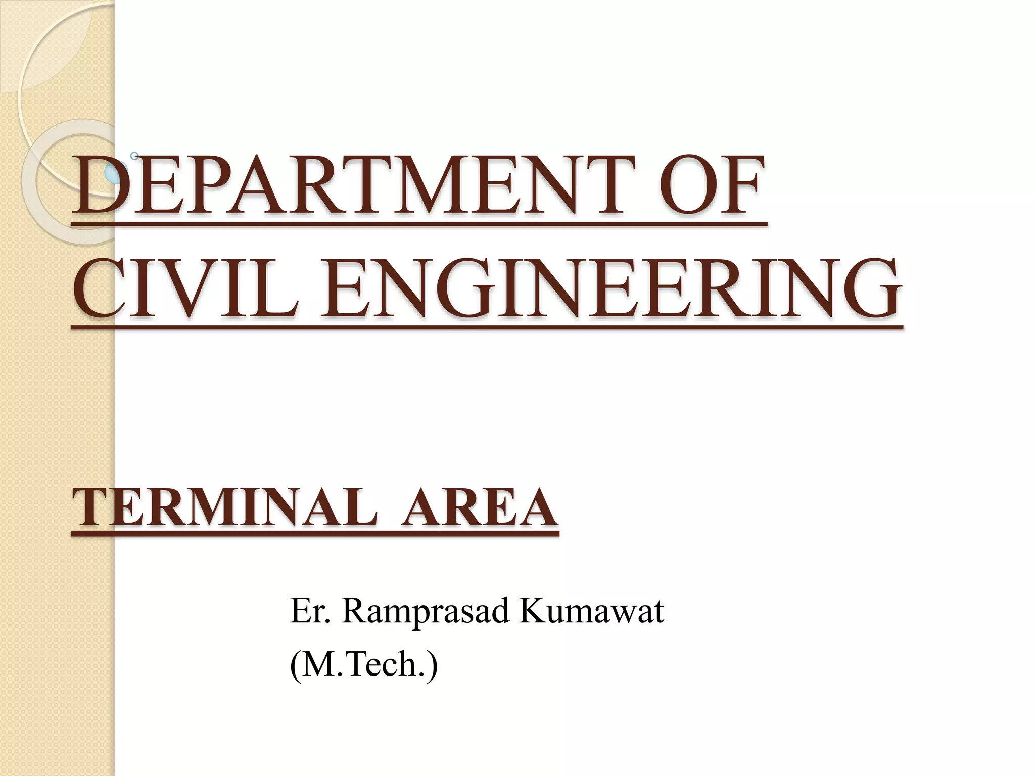 The document discusses various aspects of terminal area design at airports, including landside facilities, terminal building functions, types of terminals, and technological improvements to increase capacity and efficiency. It provides details on key landside facilities like the terminal building, passenger and baggage handling processes. The main functions of terminal buildings are outlined as circulation, processing, and holding of passengers. Different terminal types are described such as linear, pier, satellite and transporter terminals. [END SUMMARY]