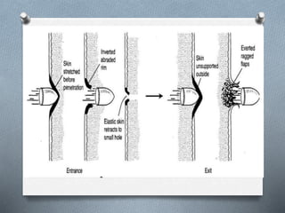 This document discusses terminal ballistics and the different types of injuries caused by firearms. Terminal ballistics is the study of bullet behavior once it impacts the target. Factors like velocity, mass, size, and shape of the bullet affect the degree of injury. Rifled firearms can cause injuries at contact range (muzzle touching body), close shot (within flame distance), and distant shots over 50cm away. Shotgun wounds depend on range, with contact shots causing discoloration and burns and long range shots rarely being fatal. Entry wounds from firearms show more tissue destruction than exit wounds, which tend to be everted with split flaps. Specific injuries include abrasion collars, contusion collars, tattooing, and blackening