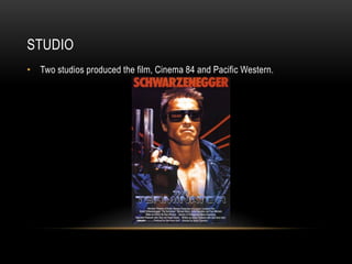 The Terminator was produced by Cinema 84 and Pacific Western with a budget of $6.4 million. It is a sci-fi and action film starring Arnold Schwarzenegger as a cyborg assassin sent back in time to kill Sarah Connor, whose son will one day lead the resistance against machines. Various merchandise and a soundtrack were released around the film's 1984 theatrical release. Stan Winston created animatronic puppets and stop motion effects were used to film scenes of the skeletal terminator.