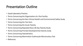 The document defines terminology used in OECD guidelines for non-clinical health and environmental safety studies. It discusses terms related to good laboratory practice, test facilities, studies, test items, toxicity studies including acute toxicity and repeated dose 28-day toxicity, prenatal developmental toxicity studies, toxicokinetics, and the mammalian erythrocyte micronucleus test. The terms are defined concisely with the context of OECD guidelines and standards for conducting non-clinical studies.
