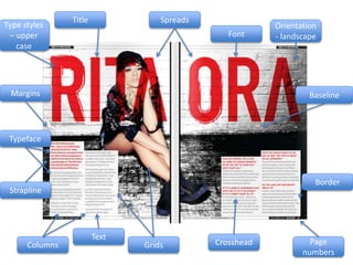This document defines various terminology used in page layout and design, including type styles like uppercase, lowercase, bold, and italic; text formatting like font, typeface, and size; page elements like titles, headlines, columns, spreads, and orientation; and positioning guidelines like margins, grids, rules, and alignment. It covers both typographic and structural terms that help organize content on a page in a clear and visually balanced manner.
