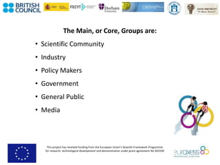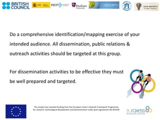 The document outlines the process of comprehensively identifying and mapping an intended audience for dissemination activities. It identifies the main target groups as the scientific community, industry, policy makers, government, general public, and media. Each group is then broken down into more specific sub-groups. It also discusses identifying the influencers of each group to help ensure dissemination messages reach key influencers across all target audiences.