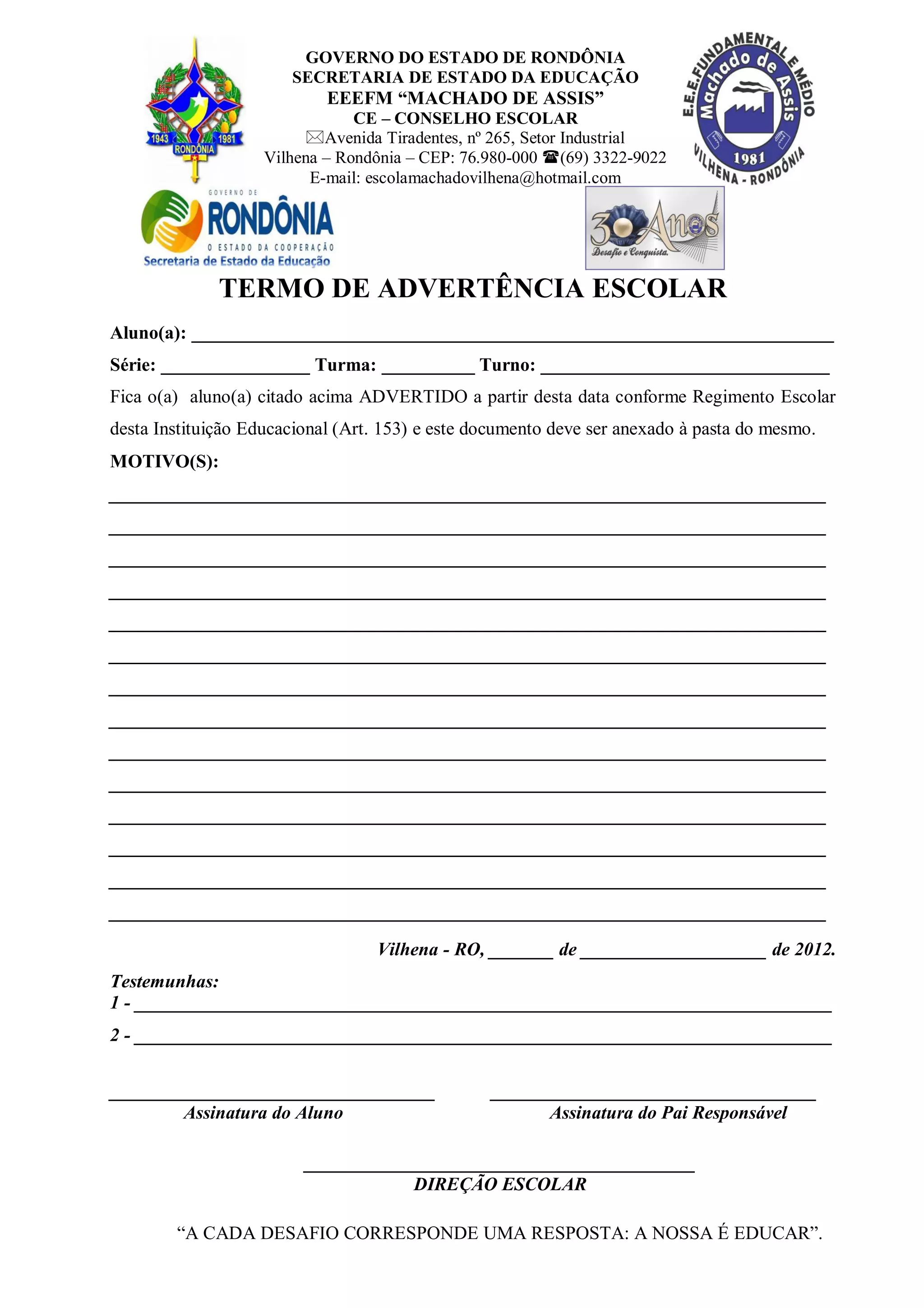 This document is a school warning notice from a school in Vilhena, Rondônia, Brazil. It notifies a student that they are being warned according to the school's regulations. The notice leaves blanks to fill in the student's name, grade, class, shift, reasons for warning, and witness signatures. It is dated and includes signatures from the student, parent, and school administration.