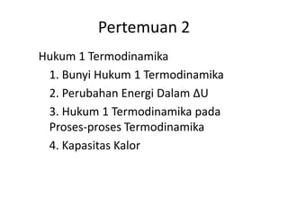 Dokumen tersebut membahas hukum pertama termodinamika, termasuk definisi hukum tersebut, perubahan energi dalam sistem, dan penerapannya pada berbagai proses termodinamika seperti isotermal, isokorik, isobarik, dan adiabatik. Juga dibahas kapasitas kalor dan besaran-besarannya untuk gas.