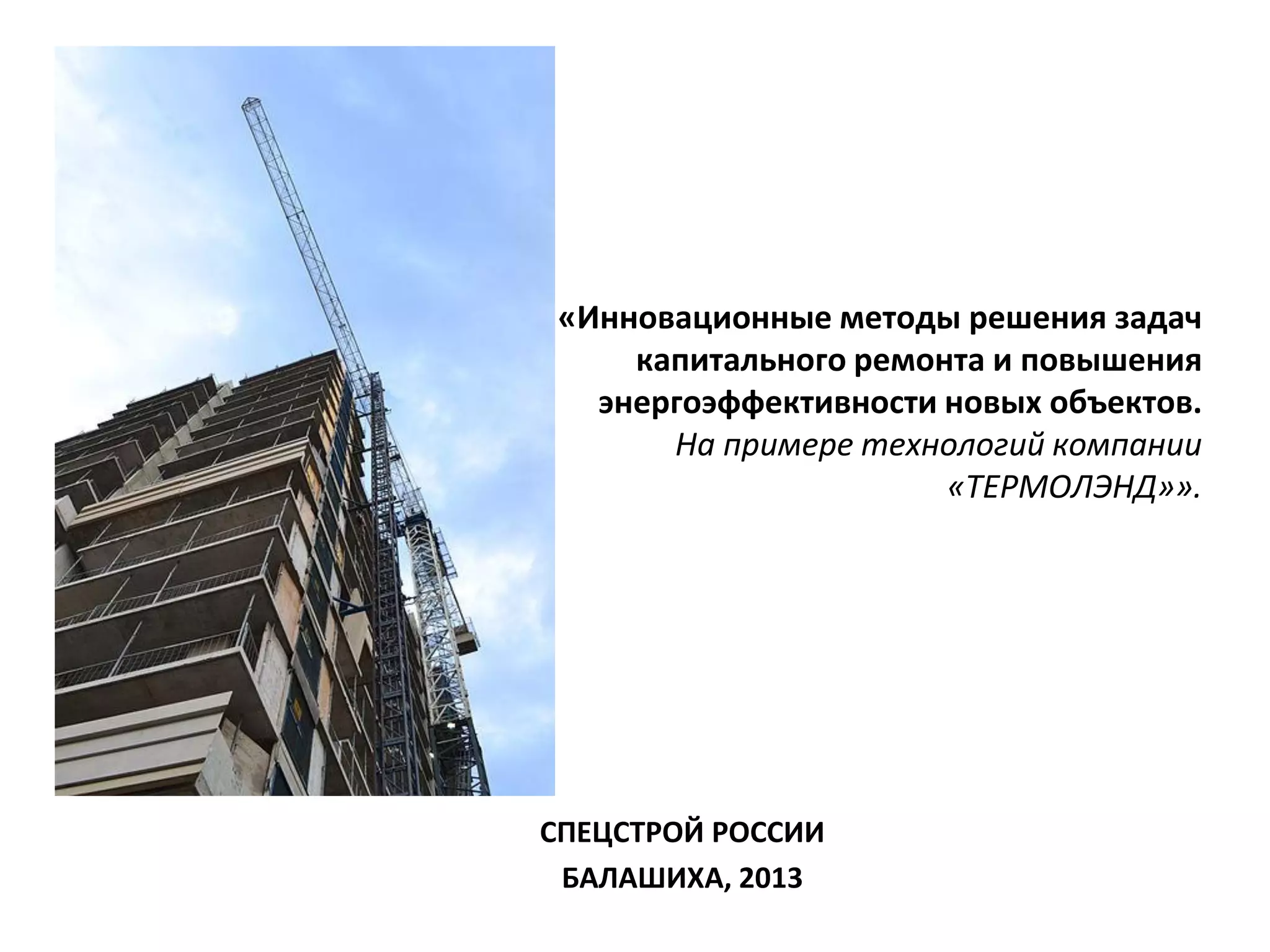 Документ описывает инновационные методы капитального ремонта и повышения энергоэффективности зданий с использованием технологий компании 'Термолэнд'. Представлены преимущества новой системы утепления фасадов, которая отличается высокой степенью автоматизации и качеством, а также экономической эффективностью в сравнении с традиционными системами. Упоминается, что данная технология внедряется в различных регионах России и отмечается её потенциал для значительного снижения стоимости и ускорения сроков выполнения работ.