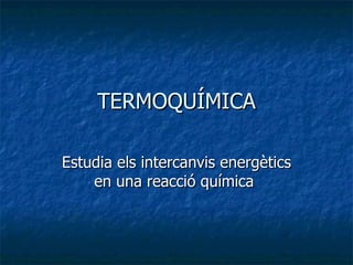 Conceptes termodinàmics Sistematermodinàmic : part de l’univers que investiguem independentment de la resta. Entorn : part de l’univers que no és el sistema. Univers = entorn + sistema Reacció exotèrmica : es desprèn energia calorífica. Reacció endotèrmica : necessiten energia calorífica per produir-se. Variable termodinàmica : magnituds que descriuen un sistema termodinàmic. Ex: calor, treball. Funció d’estat : variable termodinàmica independent del procés per arribar l’estat del sistema que descriuen. Ex: P, T, V