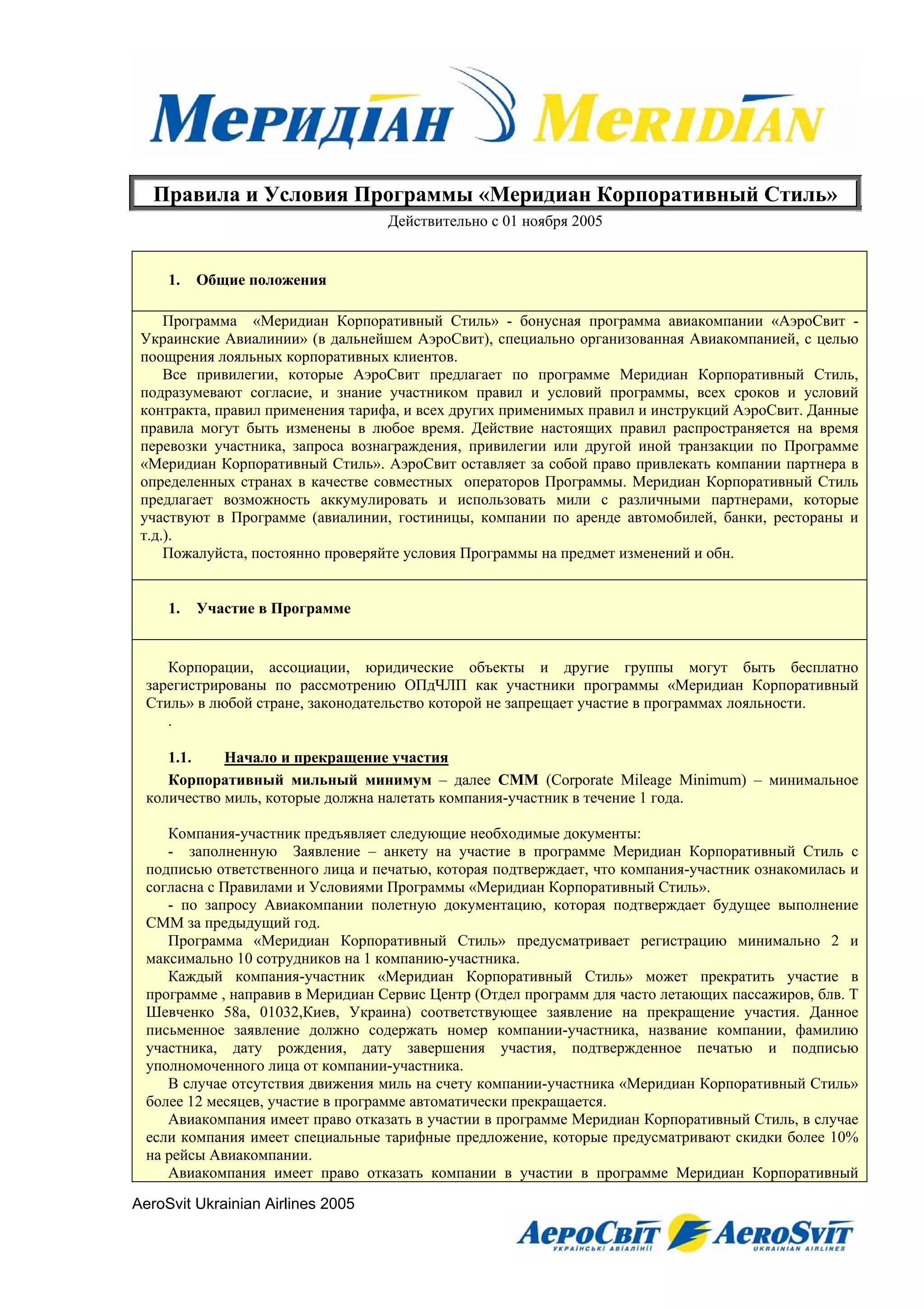 Правила и УсловияПрограммы «Меридиан Корпоративный Стиль» Действительно с 01 ноября 2005 1. Общие положения Программа «Меридиан Корпоративный Стиль» - бонусная программа авиакомпании «АэроСвит - Украинские Авиалинии» (в дальнейшем АэроСвит), специально организованная Авиакомпанией, с целью поощрения лояльных корпоративных клиентов. Все привилегии, которые АэроСвит предлагает по программе Меридиан Корпоративный Стиль, подразумевают согласие, и знание участником правил и условий программы, всех сроков и условий контракта, правил применения тарифа, и всех других применимых правил и инструкций АэроСвит. Данные правила могут быть изменены в любое время. Действие настоящих правил распространяется на время перевозки участника, запроса вознаграждения, привилегии или другой иной транзакции по Программе «Меридиан Корпоративный Стиль». АэроСвит оставляет за собой право привлекать компании партнера в определенных странах в качестве совместных операторов Программы. Меридиан Корпоративный Стиль предлагает возможность аккумулировать и использовать мили с различными партнерами, которые участвуют в Программе (авиалинии, гостиницы, компании по аренде автомобилей, банки, рестораны и т.д.). Пожалуйста, постоянно проверяйте условия Программы на предмет изменений и обн. 1. Участие в Программе Корпорации, ассоциации, юридические объекты и другие группы могут быть бесплатно зарегистрированы по рассмотрению ОПдЧЛП как участники программы «Меридиан Корпоративный Стиль» в любой стране, законодательство которой не запрещает участие в программах лояльности. . 1.1. Начало и прекращение участия Корпоративный мильный минимум – далее CMM (Corporate Mileage Minimum) – минимальное количество миль, которые должна налетать компания-участник в течение 1 года. Компания-участник предъявляет следующие необходимые документы: - заполненную Заявление – анкету на участие в программе Меридиан Корпоративный Стиль с подписью ответственного лица и печатью, которая подтверждает, что компания-участник ознакомилась и согласна с Правилами и Условиями Программы «Меридиан Корпоративный Стиль». - по запросу Авиакомпании полетную документацию, которая подтверждает будущее выполнение СММ за предыдущий год. Программа «Меридиан Корпоративный Стиль» предусматривает регистрацию минимально 2 и максимально 10 сотрудников на 1 компанию-участника. Каждый компания-участник «Меридиан Корпоративный Стиль» может прекратить участие в программе , направив в Меридиан Сервис Центр (Отдел программ для часто летающих пассажиров, блв. Т Шевченко 58а, 01032,Киев, Украина) соответствующее заявление на прекращение участия. Данное письменное заявление должно содержать номер компании-участника, название компании, фамилию участника, дату рождения, дату завершения участия, подтвержденное печатью и подписью уполномоченного лица от компании-участника. В случае отсутствия движения миль на счету компании-участника «Меридиан Корпоративный Стиль» более 12 месяцев, участие в программе автоматически прекращается. Авиакомпания имеет право отказать в участии в программе Меридиан Корпоративный Стиль, в случае если компания имеет специальные тарифные предложение, которые предусматривают скидки более 10% на рейсы Авиакомпании. Авиакомпания имеет право отказать компании в участии в программе Меридиа