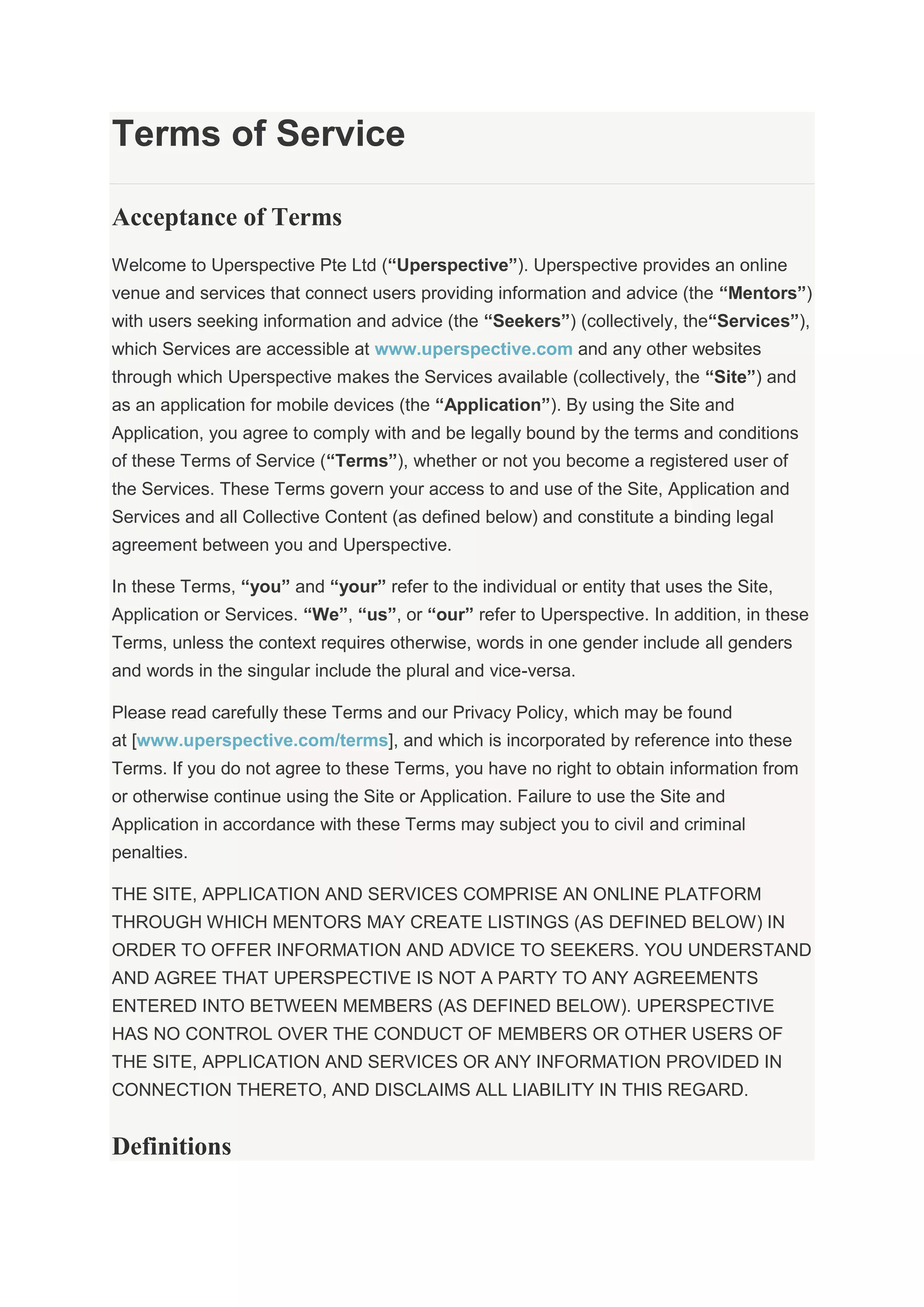The document outlines the terms of service for a platform that connects users seeking information or advice (Seekers) with users providing information or advice (Mentors). Key points: