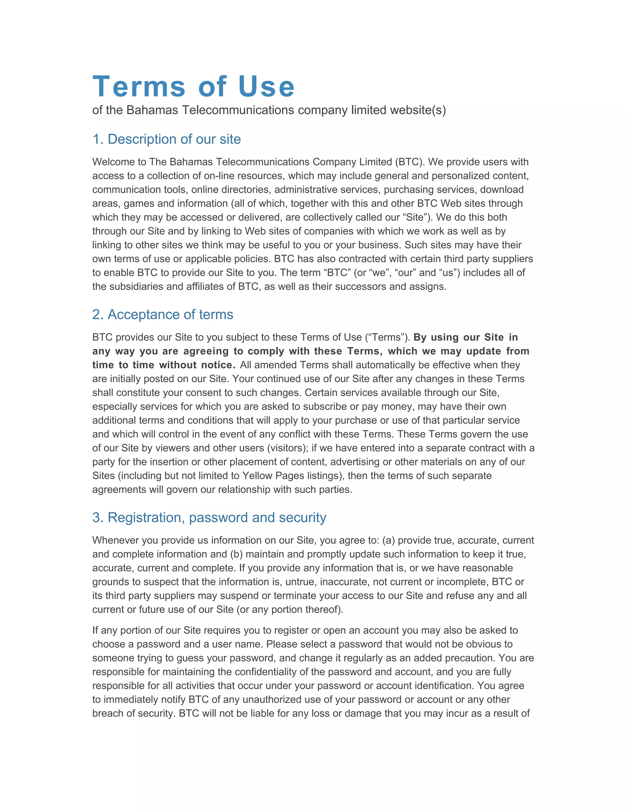 1. The document outlines the terms of use for Bahamas Telecommunications company's website. It details what content and services are provided on the site, how users can register and use accounts, privacy policies, acceptable and prohibited content, intellectual property ownership, disclaimers, limitations of liability, notices, and trademarks.