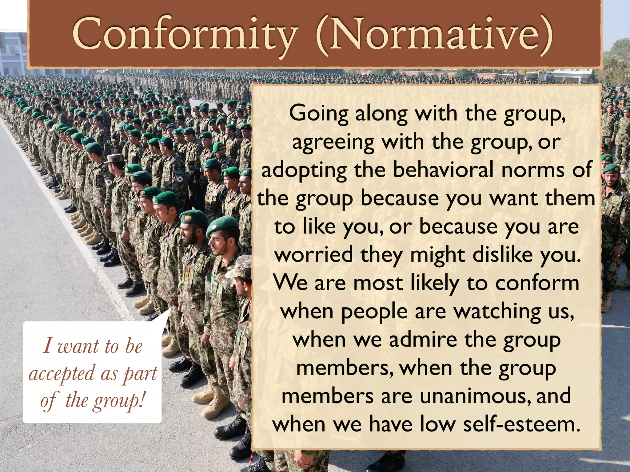 This document defines and describes several social forces and phenomena: conformity (normative and informational), obedience, diffusion of responsibility, deferral of responsibility to authority, power of the situation, social facilitation, social loafing, risky shift, and groupthink. Conformity refers to going along with a group to be liked or see them as a source of information. Obedience involves following authority figures to avoid punishment. Diffusion of responsibility means feeling less responsible as part of a group. The power of the situation impacts individual behavior. Social facilitation means performing better when observed, while social loafing means performing worse in groups. Risky shift and groupthink can lead groups to make riskier or poorer decisions than individuals