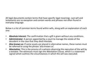 The document provides explanations of common legal terms found in last wills and testaments, such as 'administrator,' 'beneficiary,' and 'executor.' It outlines key concepts like bequests, conditional legacies, and the probate process. Understanding these terms is essential for interpreting and creating legal documents related to one's estate.