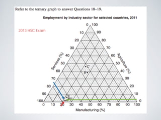 Ternary graphs are used to illustrate three sets of data that add up to 100%. They show the relationship between three variables and can be used to identify clusters and explain geographical patterns. Ternary graphs represent proportions of three components in a whole and are useful for displaying compositional data.