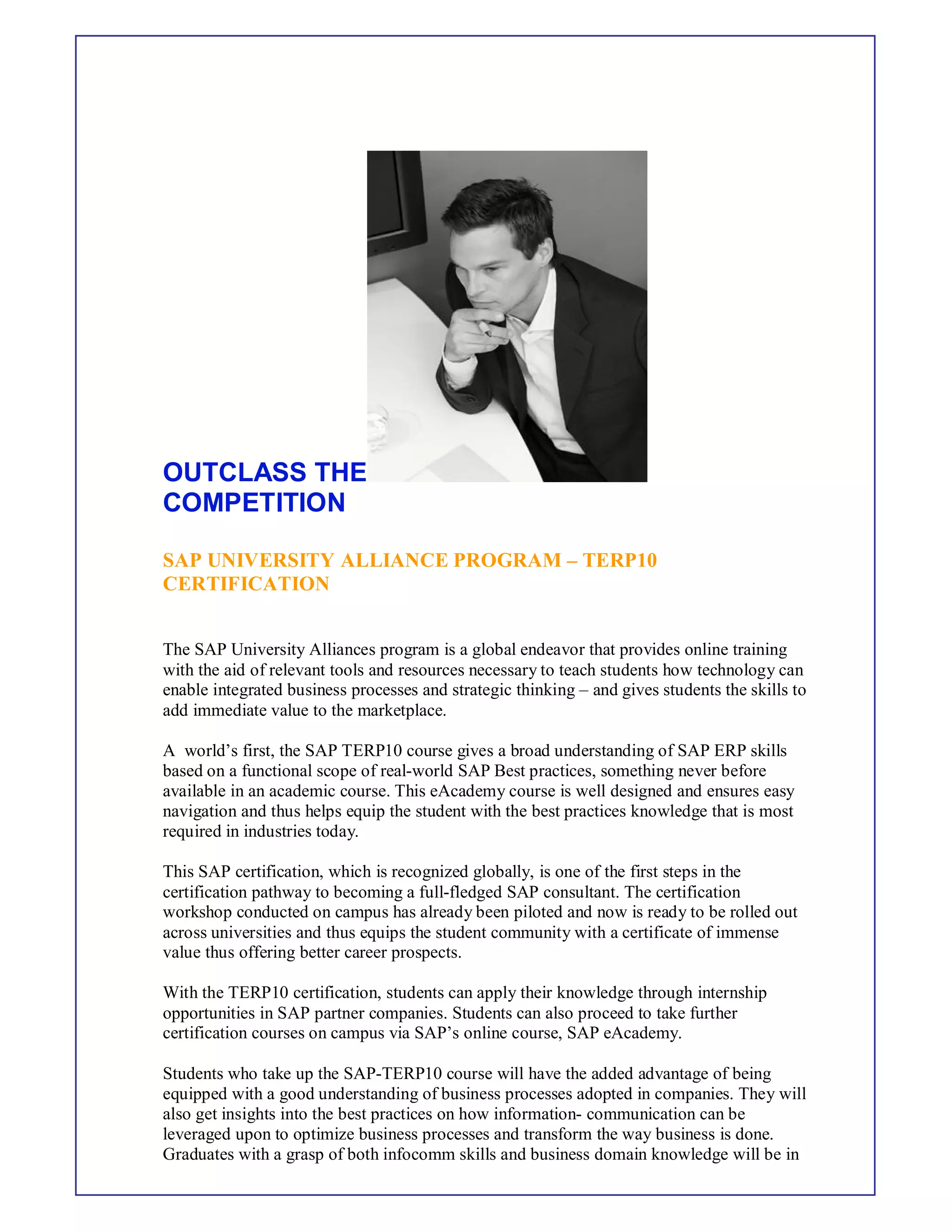 The SAP University Alliances program provides online training and resources to teach students about integrated business processes and strategic thinking using SAP software. It offers the TERP10 certification course which gives students broad knowledge of real-world SAP best practices. This globally recognized certification is the first step towards becoming an SAP consultant. Students can apply their skills through SAP internships and find career opportunities at companies that work with SAP. The TERP10 program provides valuable insights into how ERP systems like SAP support business functions and facilitate information flow in organizations.
