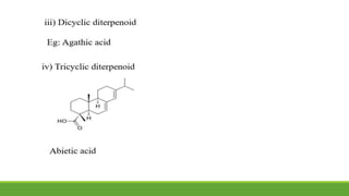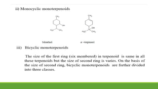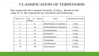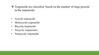 Group A presented on terpenoids, a large class of organic compounds found in plants composed of linked isoprene units. Terpenoids have unsaturated and volatile properties and represent the essential oils and active constituents of plants. They undergo various chemical reactions and can be isolated from plants through steam distillation or expression. Specific terpenoids discussed include amyrin, geraniol, and their importance. Terpenoids have many applications in perfumes, cosmetics, foods, and pharmaceuticals due to their therapeutic properties such as being antiseptic, analgesic, and insect repellents.