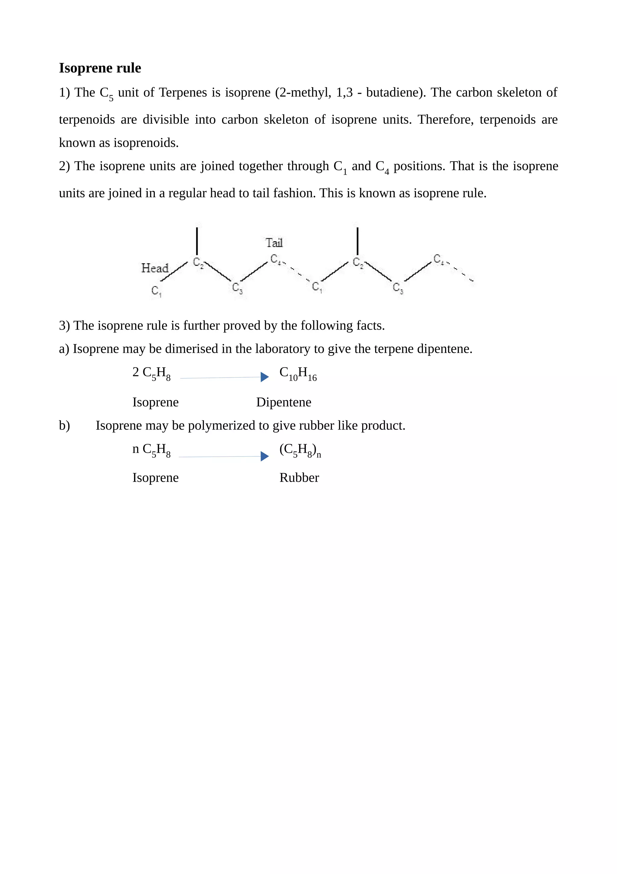 The isoprene rule states that terpenoids are composed of repeating five-carbon isoprene units that are joined together in a head-to-tail fashion through their first and fourth carbon positions. This is demonstrated by facts showing isoprene can be dimerized in the lab to form the ten-carbon terpene dipentene, and polymerized to form rubber, with the isoprene units repeating to create the carbon skeleton of terpenoids.