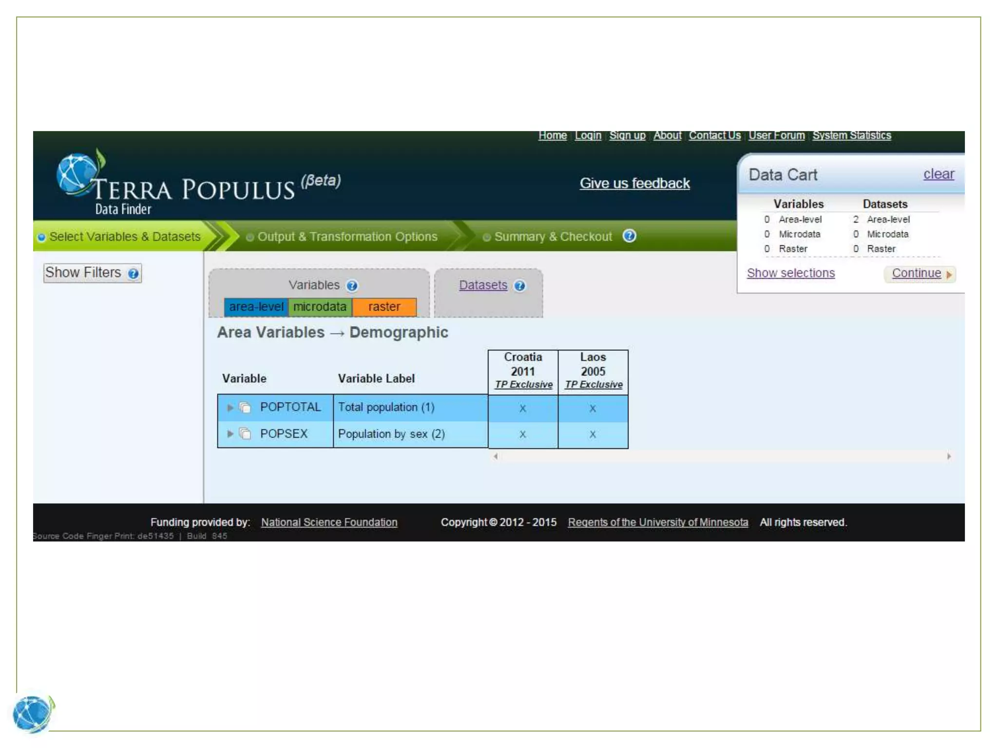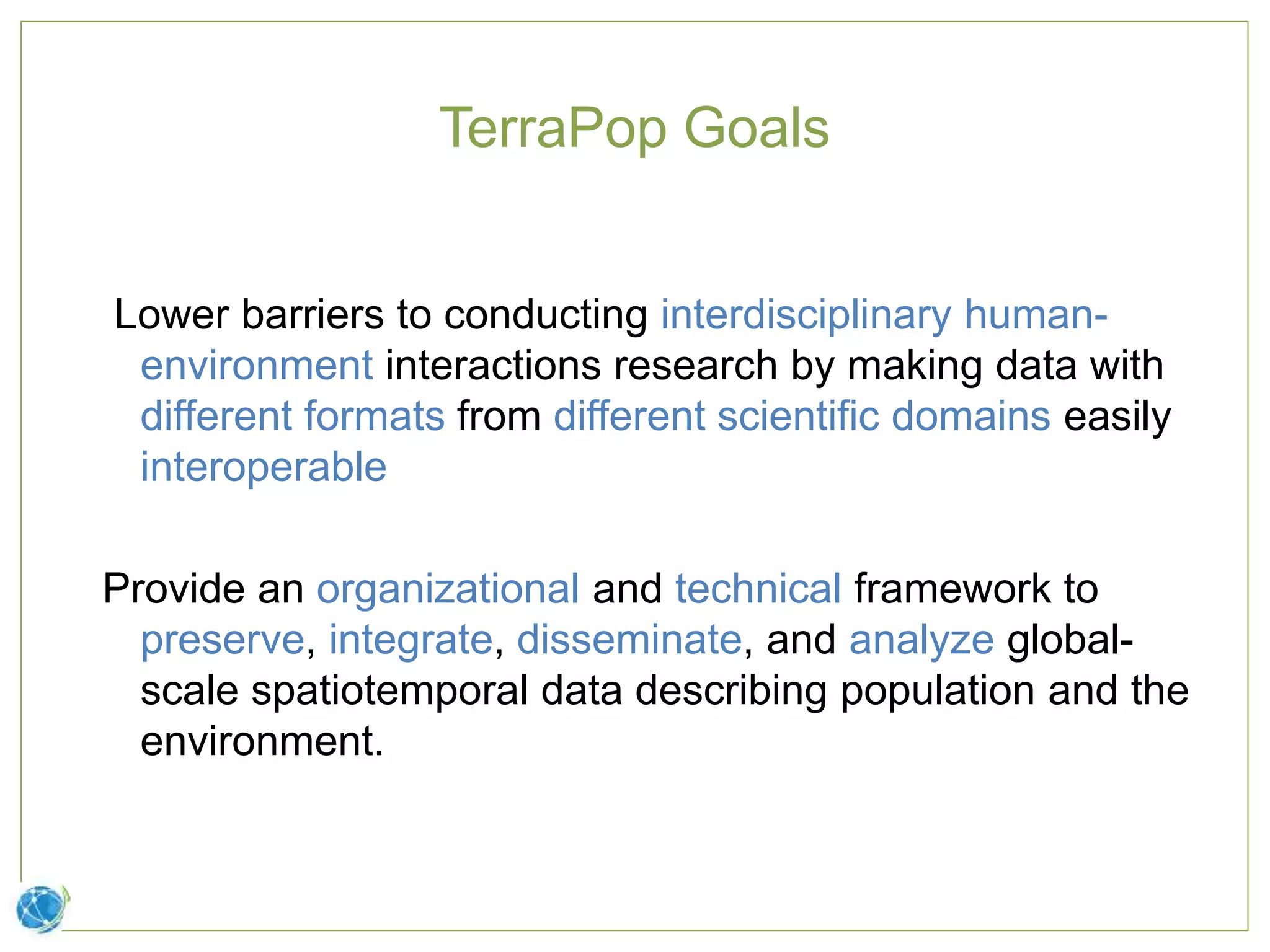 Terrapop aims to enhance interdisciplinary research on human-environment interactions by facilitating the interoperability of diverse data formats from various scientific domains. The initiative focuses on data preservation, integration, and accessibility while collaborating with organizations that specialize in data curation and sustainability. By improving data management practices and providing location-based integration, Terrapop plans to support researchers with a comprehensive understanding of population dynamics and environmental variables.