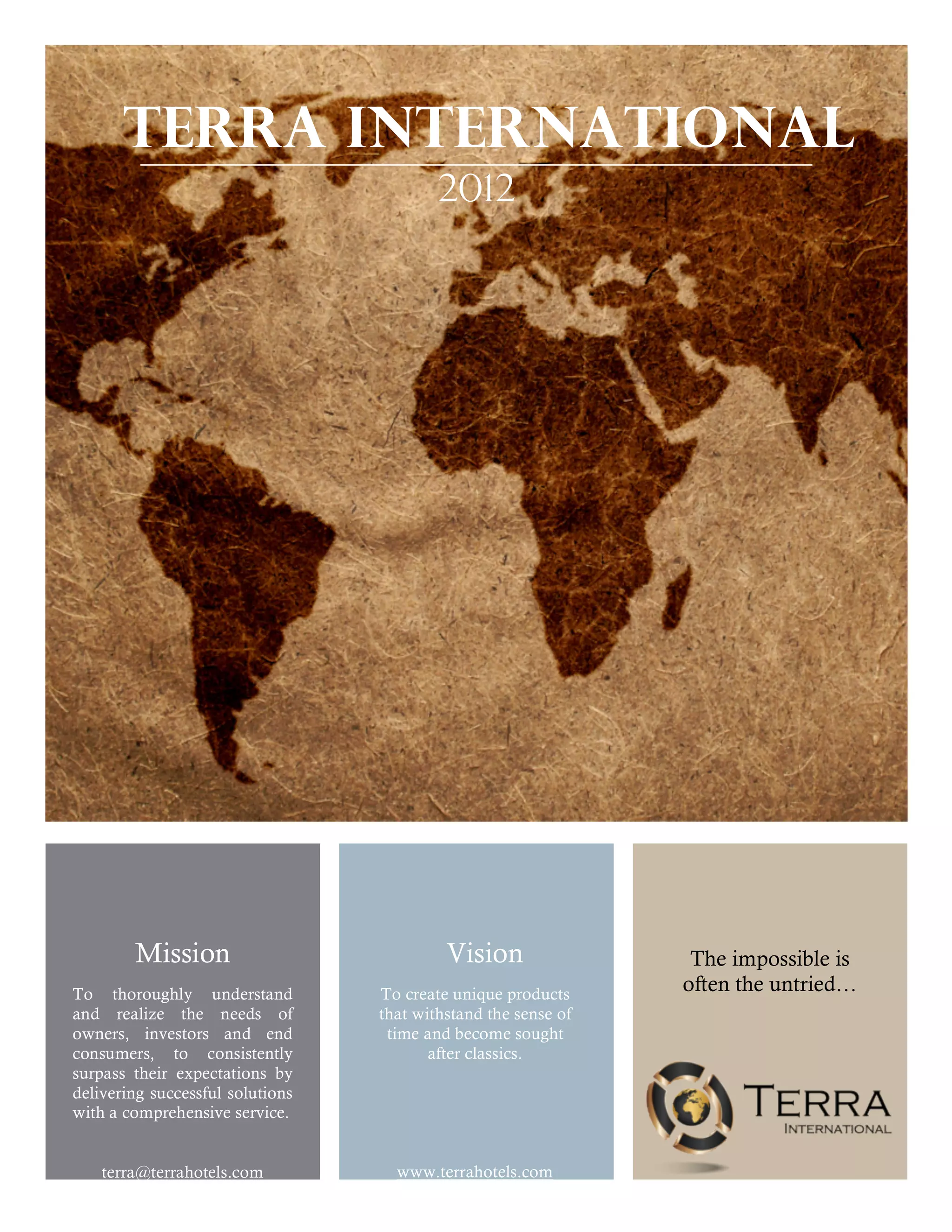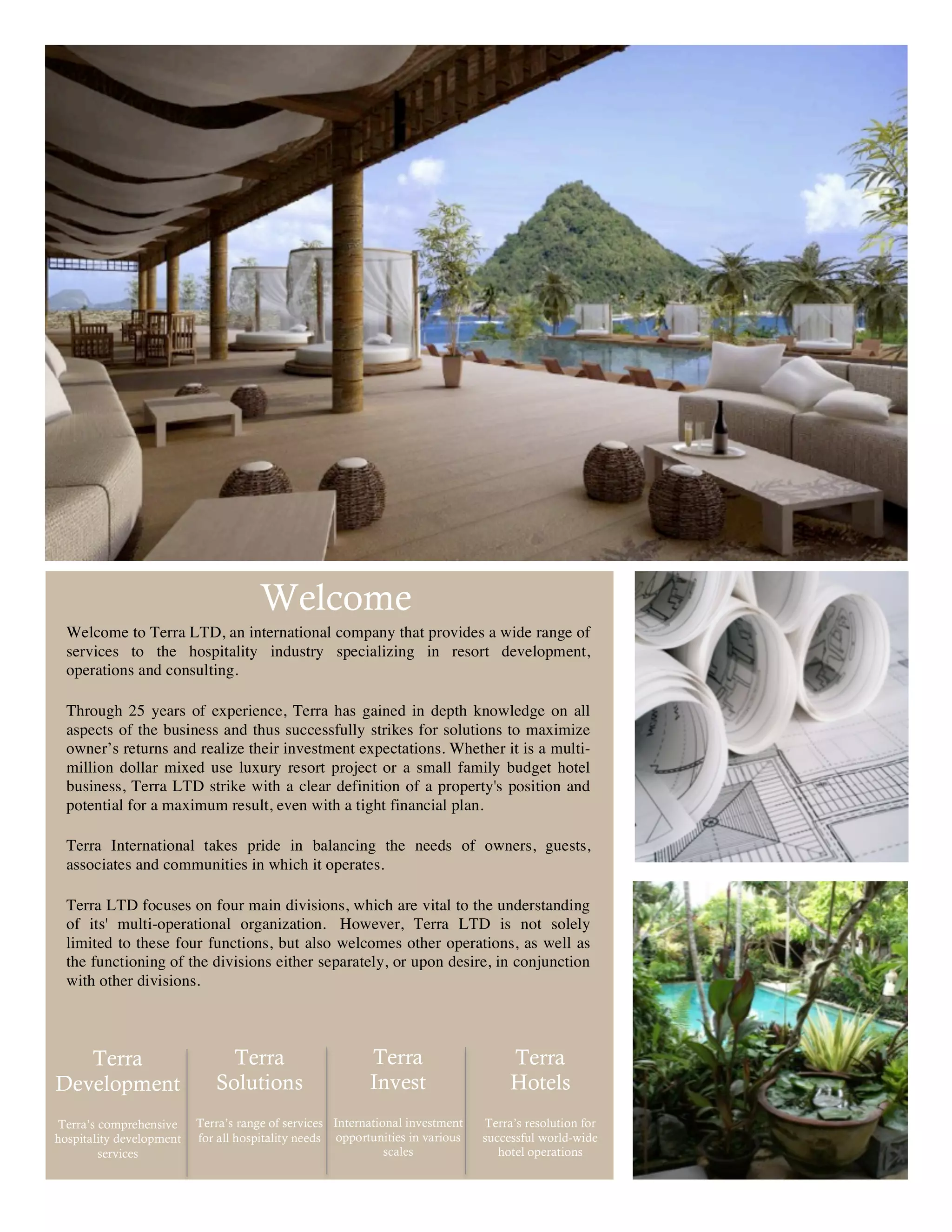 Terra International is an international hospitality company that specializes in resort development, operations, and consulting. It focuses on four main divisions: development, solutions, investment, and hotels. Terra aims to understand customer needs, maximize returns for owners, and deliver unique hospitality experiences. It has expertise developing diverse projects from luxury resorts to budget hotels. Terra also invests in hospitality opportunities and manages hotels worldwide, focusing on operational success and strong financial returns.