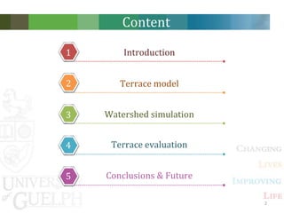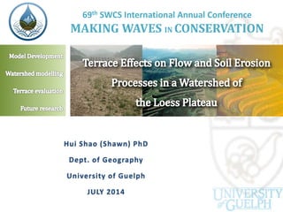 This document presents research on the effectiveness of terraces in conserving water, controlling soil erosion, and improving water quality in the Wei River basin. The study utilizes a terrace model to evaluate potential impacts on runoff, sedimentation, and nutrient management, highlighting the significant reduction in sediment transport due to terrace implementation. Conclusions indicate that terraces have effectively decreased surface runoff and sediment yields, providing vital environmental benefits in the region.