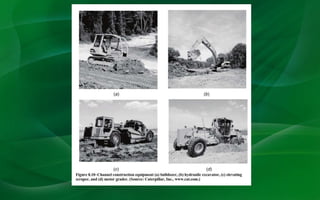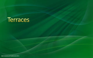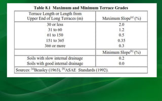This document discusses different types and methods of terrace construction. It describes how terraces are classified based on their alignment, cross-section, grade, and outlets. Terraces help reduce soil erosion by interrupting the flow of surface runoff water down slopes. The key aspects of terrace design include specifying the proper spacing, designing stable channels, and developing farmable cross-sections. Construction requires machinery like bulldozers and consideration of soil and weather conditions.