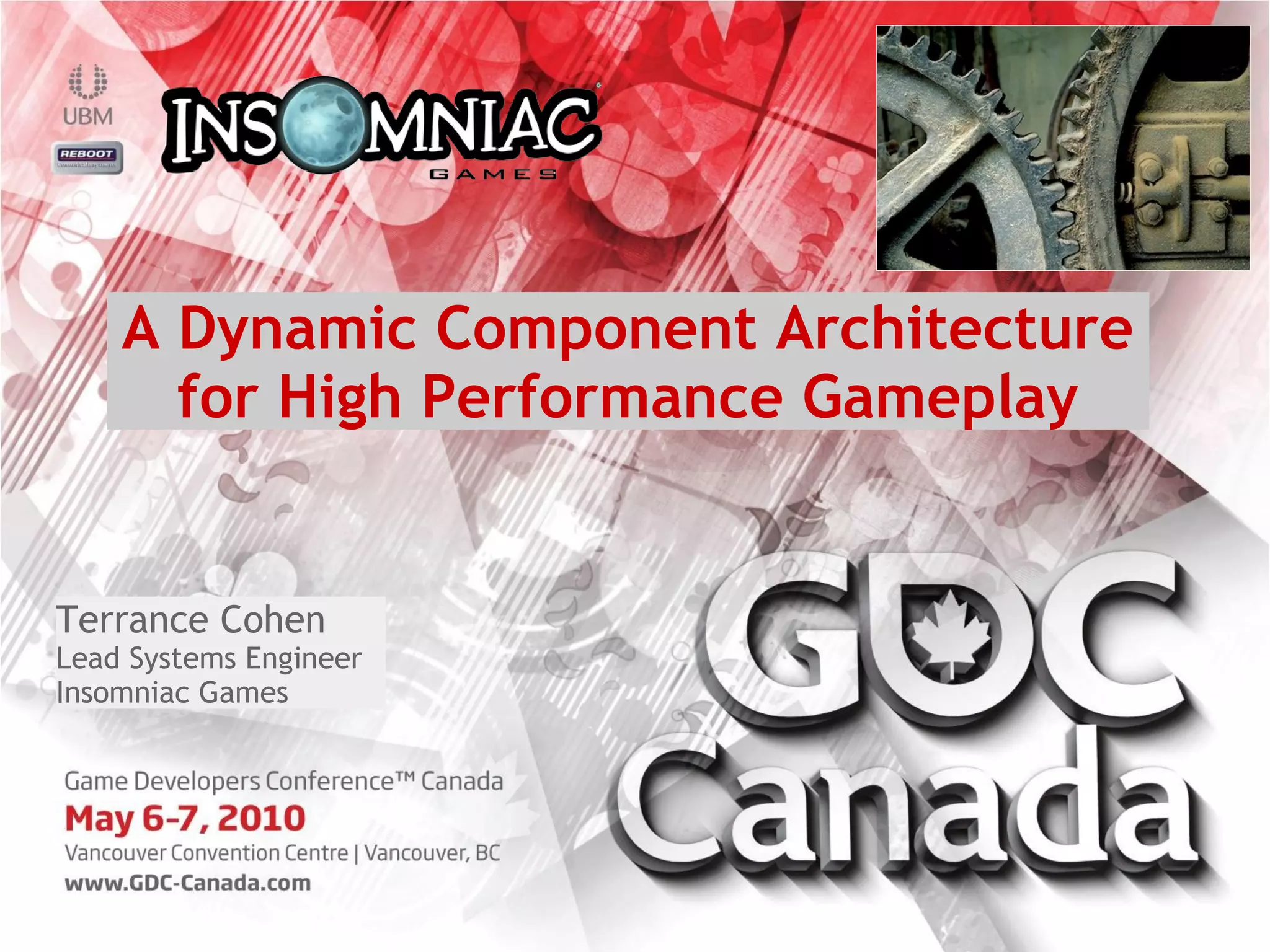 This document outlines a dynamic component architecture designed for high-performance gameplay, addressing issues with traditional monolithic game object hierarchies related to memory usage, performance, and capability inheritance. The proposed solution involves constructing game objects through the runtime composition of smaller components, which allows for better performance and flexibility. The document details the implementation, features, and evolution of the dynamic component system, emphasizing its adaptability and maturity in handling gameplay code.