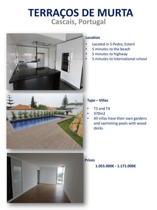 TERRAÇOS DE MURTA is a villa development located in S.Pedro, Estoril, Portugal just 5 minutes from the beach, highway, and an international school. The development consists of T3 and T4 villas ranging from 370m2 in size, each with their own garden and swimming pool with wood decks. Prices range from 1.055.000€ to 1.171.000€.