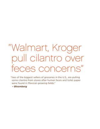 This document discusses food safety issues related to fresh produce and proposes solutions from Terra's Garden. It notes that contaminated cilantro and bagged salads have caused outbreaks and recalls costing billions. Terra's Garden has developed a patented 5-step washing process called TerraPure that thoroughly cleans produce without chemicals or human contact using organic treatments, brushing, and filtration to exceed food safety standards. They offer this technology through licensing, private labeling, or integrated services to empower brands to provide consumers cleaner produce.
