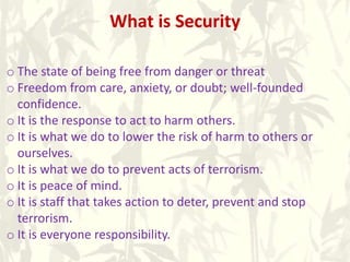 This document provides an overview of security training for human resource staff. It defines security as protecting people, material/installations, and information from harm or risks. The 3 Ps of security are outlined as protection of people, material/installations, and information. Qualities of an effective security guard are discussed such as preparedness, honesty, quick reflexes, rationality, communication skills, strength/fitness, respect for life, and education/training. Basic security responsibilities, post orders, and how to handle and document trespassing incidents are also summarized.