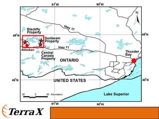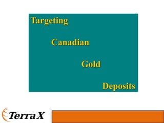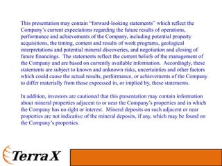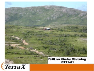 This presentation discusses TerraX Minerals' gold exploration projects in Canada. It summarizes drilling results from the Company's Stewart property in Newfoundland that indicate extensive gold and copper mineralization and alteration over hundreds of meters, similar to the giant Oyu Tolgoi deposit. It also summarizes drilling on the Company's Atikokan properties in Ontario that have intersected Hammond Reef-style and high-grade vein-hosted gold mineralization over several kilometers. The Company has a low market capitalization and experienced management team exploring these prospective projects. Drilling will continue testing geophysical targets at Stewart and follow up on results at Atikokan through the remainder of 2011.